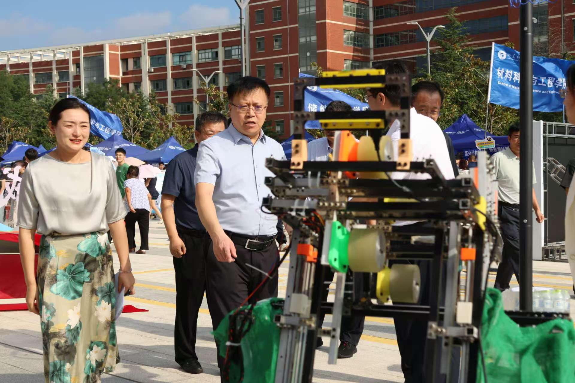 学院迎新点以“‘五’力全开,育大国‘机械+’”为主题,特别设置“五”力赋能仪式,五种颜色的彩砂分别对应“引领力、源动力、躬行力、灵动力、融合力”(学院“五维育人”核心能力),新生在志愿者引导下将彩砂倾倒入“机械+”能量仓内,寓意“五力”从此刻起融入成长血脉。此外,学院迎新点的科技展示处的机器人更是吸引了众多新生的目光,小平科技创新团队成员们为他们细心讲解,每一部投篮机器人、仿生足式机器人的背后都凝结着机电学子的心血,在新生的心中悄然种下“科创”的种子。
