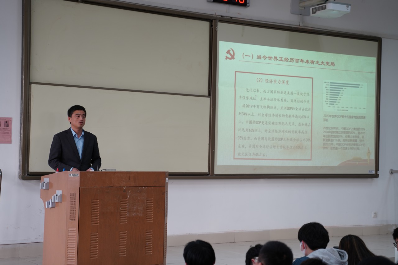 “放眼世界,我们面对的是百年未有之大变局。”穆玉兵书记从近代以来的世界格局变化讲起,通过经济实力演变、文化多样发展、治理体系调整等方面讲解了百年来中外变化。穆玉兵书记表示,新冠疫情加速了全球格局的演变,世界进入了动荡的变革区,我国正处于实现中华民族伟大复兴的关键时期,我们更应该牢记历史、不忘初心,为了中华民族伟大复兴而努力奋斗。