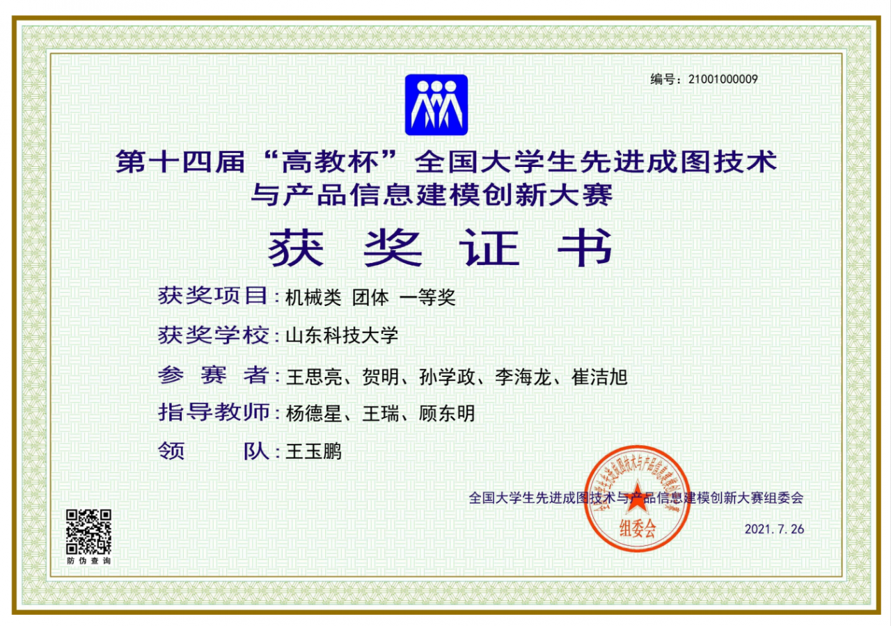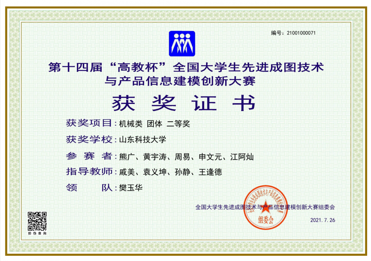 点击:近日,由全国大学生先进成图技术与产品信息建模创新大赛组委会、中国图学学会制图技术专业委员会、中国图学学会产品信息建模专业委员会、西南交通大学共同主办的第十四届“高教杯”全国大学生先进成图技术与产品信息建模创新大赛在西南交通大学顺利落下帷幕。经过激烈角逐,山东科技大学青岛校区荣获团体一等奖1项、二等奖1项、三等奖2项,个人一等奖24项、二等奖5项、三等奖6项,其中捷报比分下载 荣获团体一等奖1项、二等奖1项、三等奖1项,个人一等奖24项、二等奖3项、三等奖1项。由王思亮、贺明、孙学政、李海龙、崔洁旭组成的机械类代表队(指导老师:杨德星、王瑞、顾东明,领队:王玉鹏)获得机械类团体一等奖,这是捷报比分下载 连续七年获得机械类团体一等奖。同时由熊广、黄宇涛、周易、申文元、江阿灿组成的机械类代表队(指导老师:戚美、袁义坤、孙静、王逢德,领队:樊玉华)获得机械类团体二等奖。捷报比分下载 还获得了制图基础知识一等奖1项、二等奖1项、三等奖1项,3D打印二等奖1项,inspire优化创新设计三等奖一项。同时,杨德星、王瑞、顾东明被评为“优秀指导教师”。