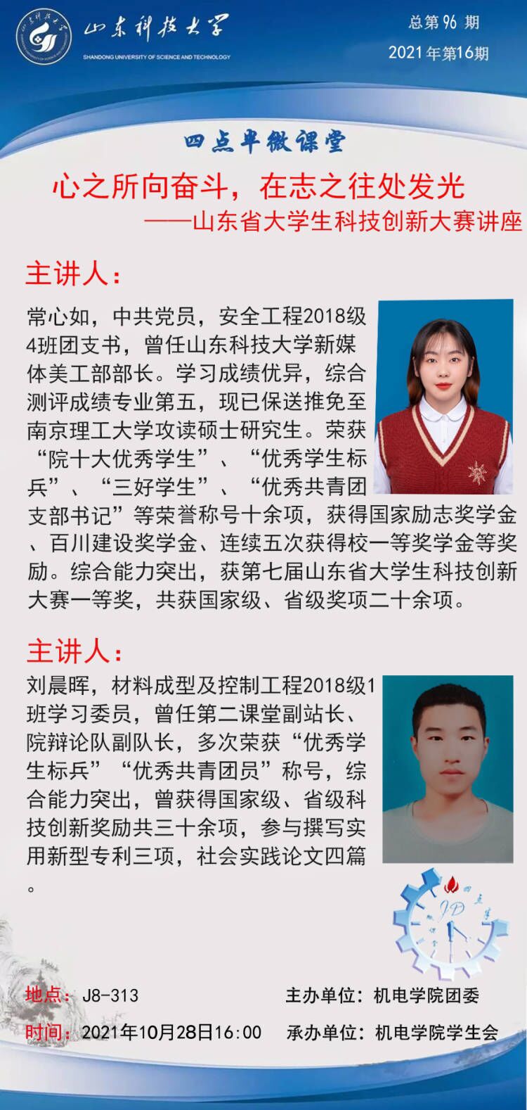 点击:为了激发学生对科技创新的兴趣,提升参赛能力,10月28日下午,捷报即时比分 在j8-313举办了“心之所向奋斗,在志之往处发光”山东省大学生科技创新大赛讲座暨第95期四点半微课堂,安全学院安全18-4班团支书常心如、捷报即时比分 材料18-1班学习委员刘晨辉担任主讲人。