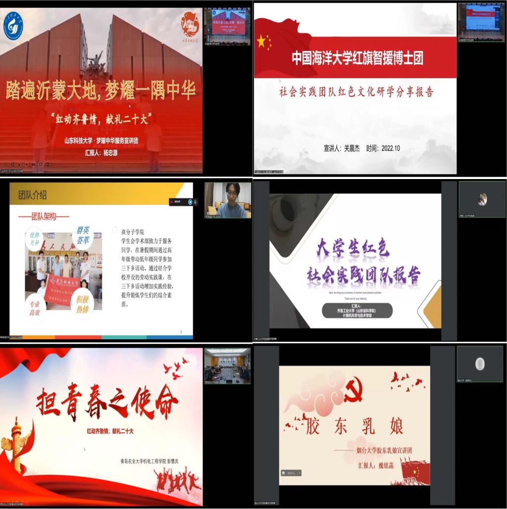 在党的二十大即将召开之际,为弘扬齐鲁红色文化,传承山东红色基因,深化驻鲁高校大学生红色实践团队研学活动,10月10日,“红动齐鲁情,献礼二十大”——驻鲁高校大学生红色社会实践团队联学共建活动在山东科技大学举行。来自山东科技大学、中国海洋大学、青岛科技大学、齐鲁工业大学、青岛农业大学、烟台大学六所高校社会实践团队相关学院团委书记、指导老师、团队成员代表线上线下参与活动。山东科技大学团委书记尹立明、研究生工作部副部长刘松、学生工作部副部长靳凯、捷报即时比分 党委副书记陈猛出席启动仪式。本次活动由山东科技大学捷报即时比分 团委书记樊玉华主持。