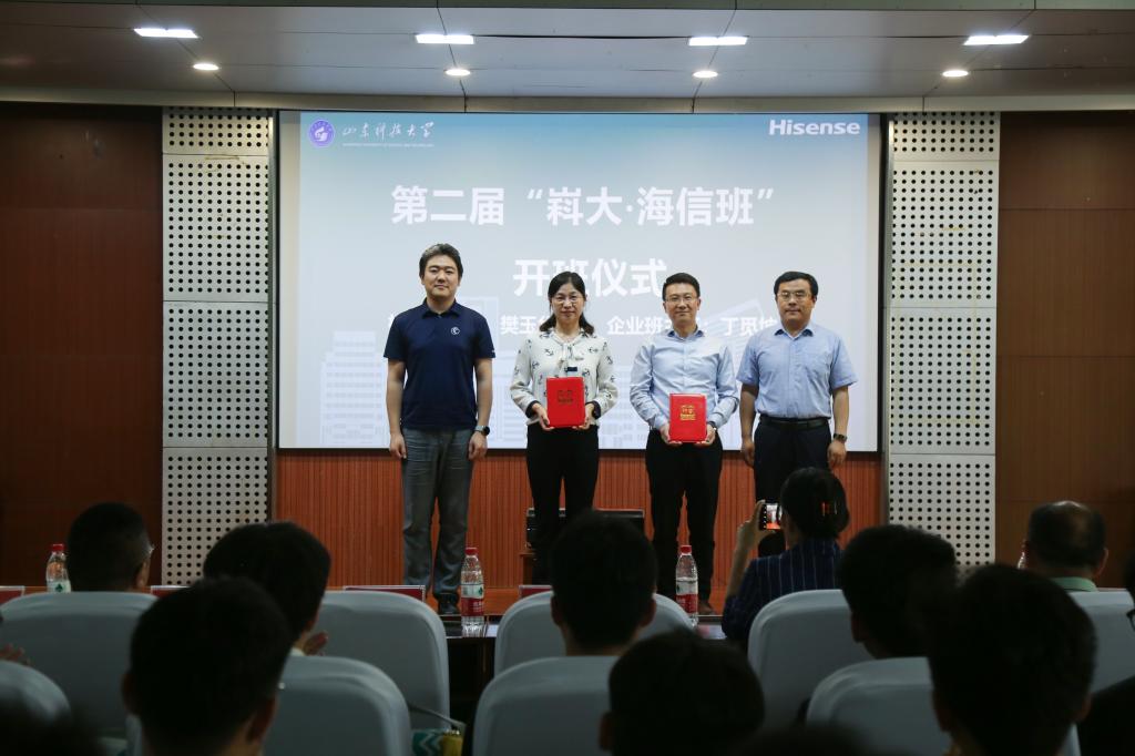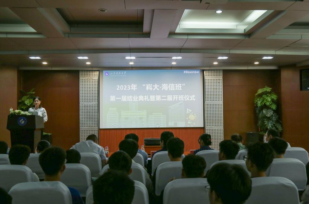 点击:为加强校企合作,深化产教结合,5月19日下午,山东科技大学与海信视像科技有限公司校企共建“嵙大·海信班”第一届结业典礼暨第二届开班仪式在山东科技大学捷报即时比分 报告厅举行。海信视像科技制造中心总经理刘广劼、海信视像科技团委书记、人力资源部副总经理梁艳华、山东科技大学合作发展处副处长王荣超、相关学院学生工作负责人以及部分校企海信班工作人员出席本次活动,捷报即时比分 团委书记樊玉华主持本次活动。