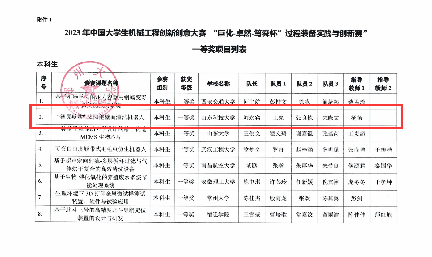 点击:8月26日,由中国机械工程学会主办,郑州大学承办的的中国大学生机械工程创新创意大赛系列赛事——“巨化-卓然-笃舜杯”过程装备实践与创新赛总决赛落下帷幕。经过激烈角逐,捷报比分下载 学子斩获国家级一等奖1项、二等奖4项、三等奖2项,杨扬老师指导的项目《“智灵壁洁”-太阳能壁面清洁机器人》荣获国家一等奖。