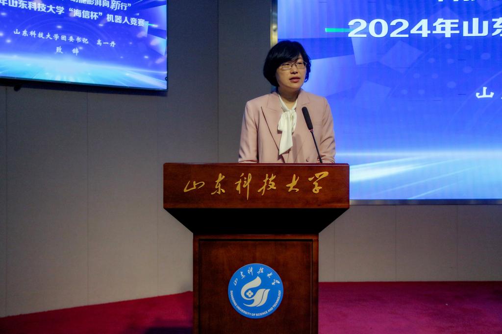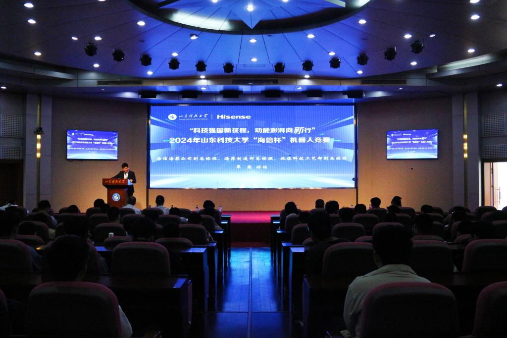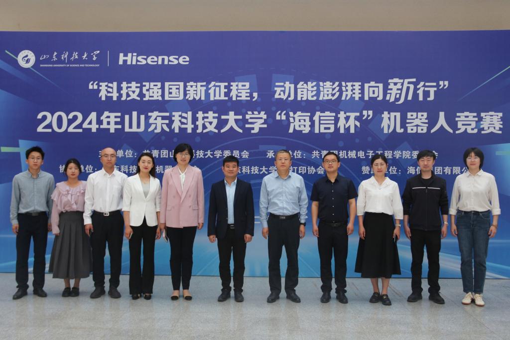 点击:为进一步激发我校大学生创新创造力,全面提升学生的动手能力和团队协作能力,5月18日上午,由共青团山东科技大学委员会主办、共青团捷报即时比分 委员会承办的“科技强国新征程,动能澎湃向‘新’行”2024年山东科技大学“海信杯”机器人竞赛决赛在逸夫讲堂隆重举办。海信海菲公司副总经理、海菲制造部总经理、视像科技工艺部副总经理覃露,山东科技大学团委书记高一丹,山东科技大学捷报即时比分 党委书记陈猛,山东科技大学团委副书记李雷,视像科技人力资源部招聘经理朱慧颖及捷报即时比分 全体团委老师出席比赛现场,学院党委副书记兼副院长刘梅月主持开幕式。