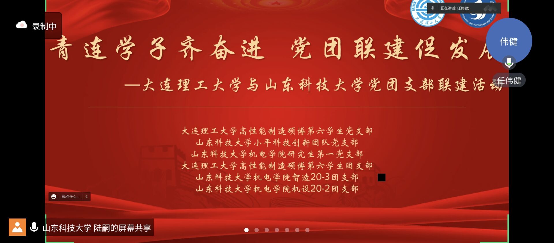 点击:为贯彻落实党的二十大精神,构建异地高校党团联建新格局,搭建研究生学术交流新平台,5月14日,捷报即时比分 小平科技创新团队党支部、研究生第一党支部、智造20-3团支部、机设20-2团支部与大连理工大学高性能制造硕博第六学生党支部、团支部在线上共同开展“青连学子齐奋进 党团联建促发展”第三期活动。本次会议由山东科技大学捷报即时比分 研究生第一党支部书记陆嗣主持,会议内容为科研经验共享。