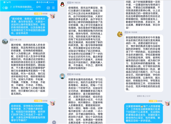 依托QQ群,支部全体党员纷纷畅谈收获与感动。围绕“抗疫”中如何践行党员责任与担当谈心得,围绕自身参与疫情防控工作经历谈感动瞬间,围绕校园封闭管理下的坚持科研谈感想。